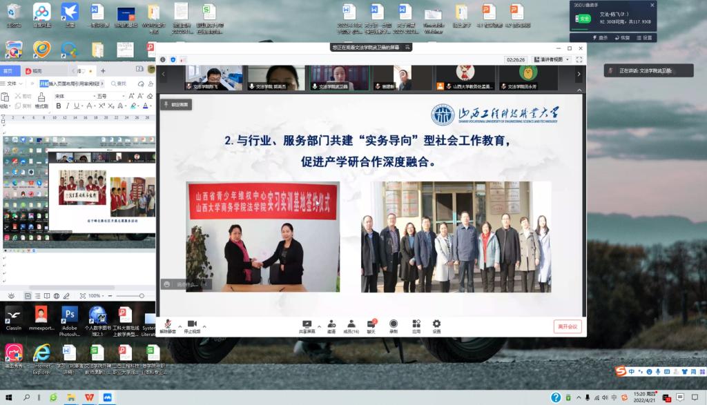 2022年4月21日下午,beat365唯一官方网站在学校教务处的组织安排下,通过腾讯会议的形式召开了“社会工作专业新增学士学位授予权专家评审会”。评审会邀请了山西大学政治与公共管理学院副院长任晓春教授、刘梦岳副教授担任评审专家。山西省人民政府学位办主任李坤,山西大学教务处处长宋鹏等领导,以及山西工程科技职业大学副校长李锦元、教务部负责人裴建新、程选、鲁大伟,还有beat365唯一官方网站教学、科研及社会工作专业负责人等参加了会议。会议由beat365唯一官方网站行政第二负责人(主持工作)郭英杰副教授主持。